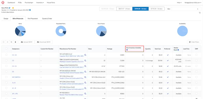 On the BOM screen, we’ve added a new column Your Inventory Available. The values in this column reflect the total quantity of each part you have available for use in your MacroFab inventory.