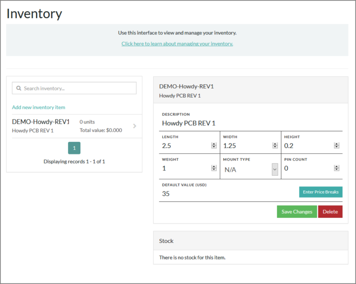 Part Numbers / SKUs need to be meaningful. If you’re shipping in a part to be used in building PCBs, it should have the exact manufacturer part number you intend to use in your PCB's Bill of Materials, otherwise the platform will not be able to offer you to build from inventory for that part. If you use the inventory item in other ways, treat the Part Number as a SKU. A SKU is a Stock Keeping Unit, a unique identifier for your item that will be used in numerous places, but especially in inventory. Once you have entered the MPN or part number, please also add the part attributes - Mount type and Pin count. This is critical as the platform will not allow one to use a part without the attributes.