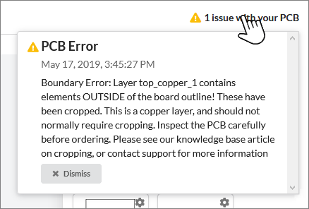 For some layers, this is not a serious problem. Silkscreen or solder-mask features which are outside of the border do not normally have an impact on the final result. For other layers such as copper and drills, this may result in your board not being manufactured as you expect. The platform provides an warning to you in the PCB Design Viewer indicating that we have cropped features from your board which were outside of the board outline.