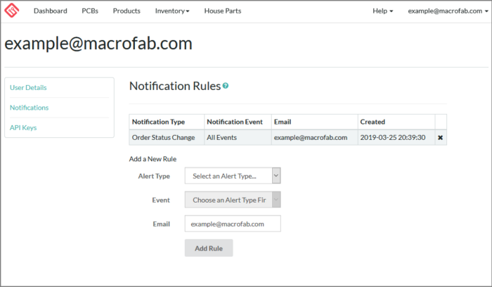 - Order Progress Event: These alerts are sent when something is done with your order: whether we’ve ordered PCBs, received, them, or put one of your PCBs into a machine. They give you a real-time view into what’s happening with your order.