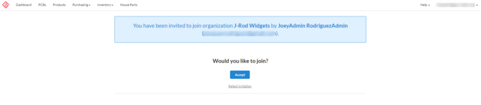 Users with an existing MacroFab account who decide to reject the invitation will not be added to the new Organization, and their PCBs will remain under their account. Both parties receive an email letting them know the user rejected the invitation.
