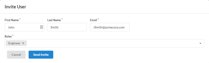 Once clicked, the following will appear. Fill out your teammate's first name, last name, and email, then designate one or more roles for them. See How to use the Roles & Permissions Manager for details on managing roles.