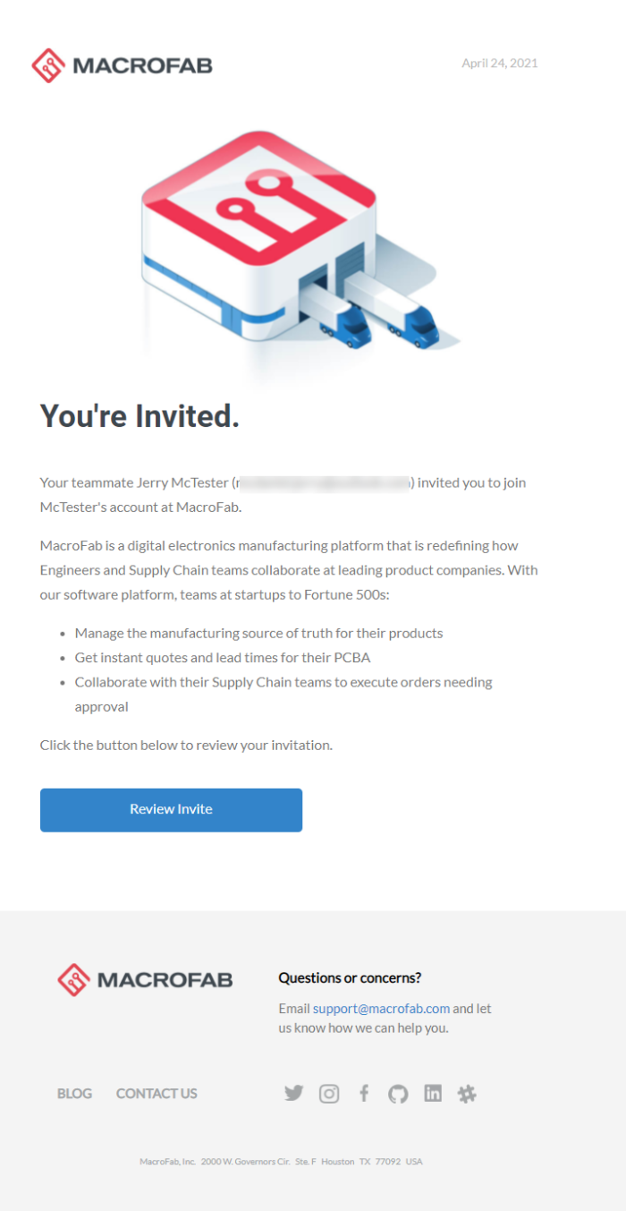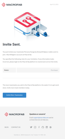 Invitations allow you to quickly add users to your MacroFab account so that you can collaborate with the quote m on designing PCBs, ordering PCBs, or managing production releases.