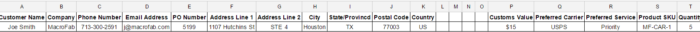 If a customer is buying multiple products at once, don’t create new row for each product as this will create multiple shipments. Instead, you should repeat the Product SKU and Unit Count columns for each unique SKU to add to the order. (See the example above, which shows two unique products in one order.)