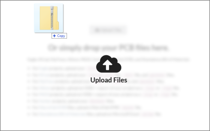 In the PCB tab, simply drag-and-drop your manufacturing package into the file upload target. Alternatively, you can click the Upload Files button on the right side of the screen. More information about uploading files to the platform can be found on the knowledge base article Creating a PCB and Uploading Design Files. The Bill of Materials .XLSX format upload procedure can be found here.