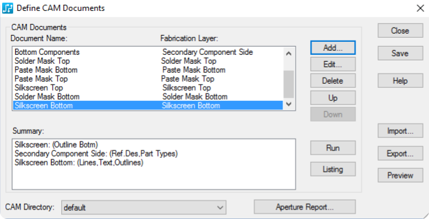 Now you must repeat the steps of adding and defining the layers for your design until all of the necessary manufacturing layers are included in the CAM processor. The image below shows the CAM documents window with all of the layers to be exported.