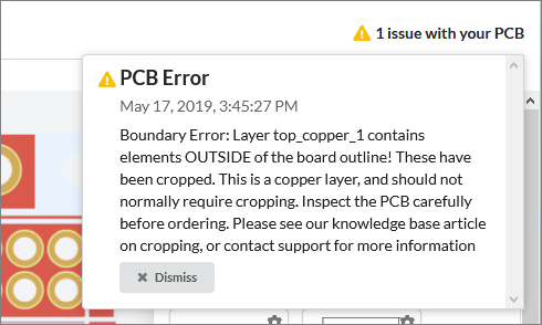 If the PCB you uploaded has problems with the layer files or processing issues you will see a yellow triangle in the upper right of the Design Viewer. This is where issues with your design files will be if there are any. Think of this as the DRC for your manufacturing files.