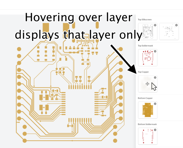 Hovering over the gear icon on the file will bring up a context menu for the layer. The menu will show the name of the layer and functions that allow deleting the file, pinning the file to be visible all the time, and moving the file to another layer. You can pin multiple layers at a time. Pinning layers turns the PCB viewer from a “realistic” render of the PCB to a gerber representation of the layer. You can also drag the layer to another section if you need to swap layers around!