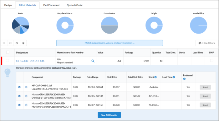 If your supplied bill of materials has the manufactures part number (MPN) and associated part designator the system will try to auto match and select parts based on the supplied information. The platform will only auto fill the part selection if it is 100% certain the part match is correct. Otherwise, the platform will suggest a list of parts that it thinks are correct. For some of our supported EDA tools, the platform can extract the MPNs directly from the source file.