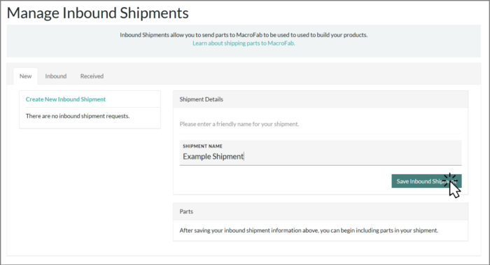 The MacroFab Platform allows you to easily create and manage inbound shipments for your inventory management needs.