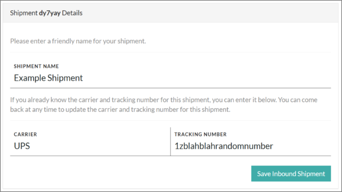 Use the Shipment Details box at the top to add the Carrier and Tracking Number. These fields are optional and you can complete the shipment without them. Make sure you Save Inbound Shipment after filling out the fields. It is highly recommended that the Carrier info and Tracking Number are filled out to help ensure your inventory is tracked properly.