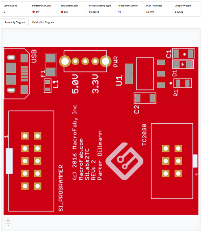 The fabrication diagram shows a true-color rendering of the PCB, while the assembly diagram shows a grayscale representation of the PCB with the components drawn on top.